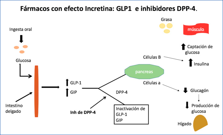 DM2, al aumentar los niveles de GLP1 y prolongar su acción