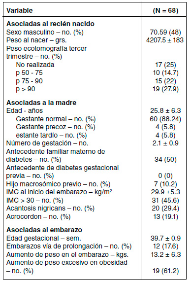 Durante el período de observación, 68 madres con RN macrosómicos cumplieron los criterios de elegibilidad para el estudio. Las características generales se describen en la Tabla 1.