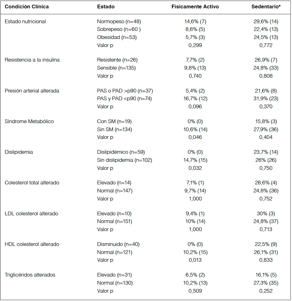 Apenas 15 participantes del estudio fueron considerados físicamente activos (9,4%), mientras que al usar el criterio percentilar, 40 fueron considerados sedentarios (24,8%). En la tabla 2 se resumen las frecuencias de condiciones clínicas y alteraciones del perfil lipídico de acuerdo a las condiciones de físicamente activos y conducta sedentaria.