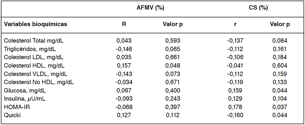 En la tabla 3 se muestra la correlación de %AFMV y %CS con parámetros bioquímicos. El %AFMV se correlacionó positivamente con concentraciones de cHDL (r=0,157; p=0,048). Por otro lado, el %CS se correlacionó positivamente con la concentración de glucosa plasmática (r=0,159; p=0,044) (Tabla 3). Además, el %CS se observó directamente correlacionado con valores de HOMA-IR (r=0,178; p=0.037) e inversamente con Quicki (r=-0,160; p=0,044).
