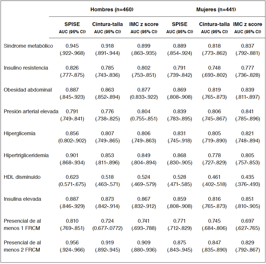 La tabla 2 muestra la capacidad de predecir el RCM (AUC) del índice de SPISE (≤ 5.4) de la relación cintura/talla (≥ 0.54) y del z-IMC (≥2.0 DE) en varones y mujeres. En ambos sexos, el índice de SPISE mostro una mejor capacidad para predecir el MetS (0.95 y 0.89, respectivamente) y la IR (0.83 y 0.79, respectivamente) comparado con la relación cintura/talla y el IMC-z. Asimismo, SPISE tuvo mayor capacidad para predecir los componentes del MetS, excepto para la predicción de la presión arterial elevada donde el z IMC ≥2.0 DE tuvo valores de AUC discretamente mayores. Destacamos que todas las AUC de SPISE estuvieron en un rango de rendimiento diagnóstico bueno o muy bueno, excepto al diagnosticar HDL bajo, lo que también se observó con los otros dos indicadores.