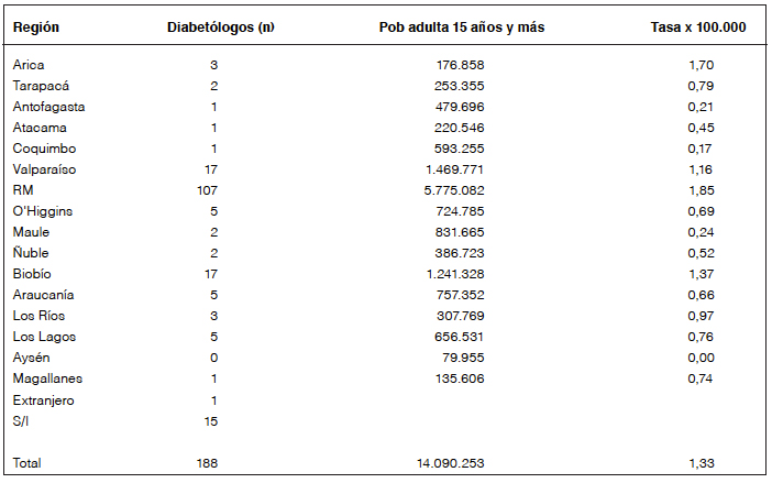 Del total de endocrinólogos del país, 21 de 340 no tienen registro de la región donde ejercen -17 internistas, 4 pediatras-, que fueron excluidos del análisis poblacional.