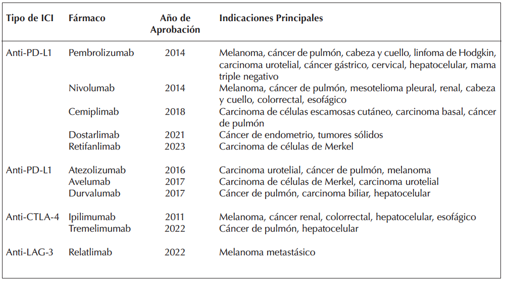 Tabla 1. Inhibidores de puntos de control inmunológico aprobados por la FDA y sus principales indicaciones