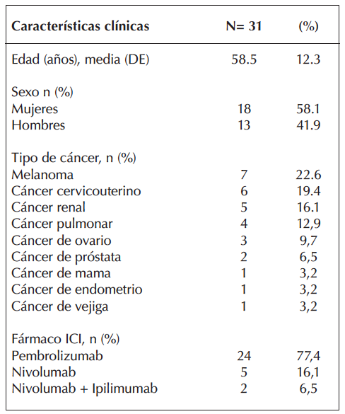 El objetivo de este trabajo fue describir las características clínicas de una cohorte de 31 pacientes que recibieron tratamiento con ICIs y desarrollaron ME.