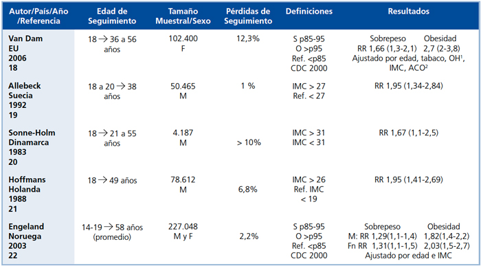 Por último, se encontraron 7 estudios de cohorte que evalúan la asociación existente entre la obesidad infantil y la mortalidad por enfermedades cardiovasculares. De estos, 4 no encontraron ninguna asociación, 1 muestra asociación sólo en el sexo femenino, 1 sólo asociación en el sexo masculino y otro señala asociación en ambos sexos. Todos los estudios presentan sesgos importantes que podrían invalidar los hallazgos encontrados, por ejemplo, en el estudio realizado por Manson y colaboradores25 se utiliza como referencia una población con IMC <19 a los 18 años de edad, población que se encontraría muy cercana al riesgo de desnutrición según el valor de referencia internacional para ésta, que es de IMC <18,5. En el trabajo publicado por Rich-Edwards y colaboradores26, se presentó una perdida del 45,6%, no caracterizada según las variables que podrían alterar los resultados, por ejemplo el estado nutricional. El estudio de Must y colaboradores27 presenta varios errores metodológicos, como utilizar como población expuesta a aquellos niños que se encuentran sobre el percentil 75 y no considerar los puntos de corte establecidos en el percentil 85 para sobrepeso y 95 para obesos. Otro factor limitante es que sólo se consideró como población de control a aquellos individuos que se encontraron entre el percentil 25 y 50, no incluyendo a los que estaban entre el percentil 5 y 25; tampoco se incluyó a aquellos que se encontraron entre el percentil 50 y 75. Además, para clasificar a los individuos no se utilizó ningún estándar de referencia, usándose la propia distribución muestral de los participantes. El tamaño muestral fue relativamente pequeño (508 niños), no aclarándose si la muestra se constituyó a partir de un muestreo probabilístico o no.
