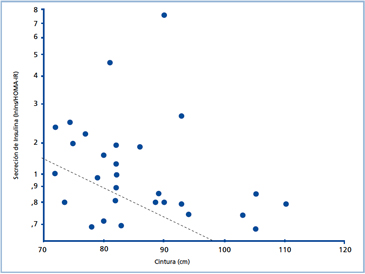 Por otra parte, si bien se conoce que la célula Beta y su secreción son importantes en la génesis y progresión de la diabetes tipo 26, hasta el momento no se conocen estudios que permitan correlacionar algún indicador antropométrico con índices de secreción de insulina. De esta manera, creemos que éste es uno de los primeros trabajos que muestra cómo un indicador antropométrico de la obesidad abdominal es también reflejo de la secreción insulínica.