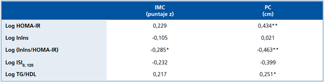 En relación al puntaje z de IMC, sólo se encontró una asociación débil con Log (InIns/HOMA-IR) (R = -0,285; p ≤ 0,05), sin asociación con las otras variables.