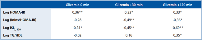 Existe una correlación positiva y significativa entre el Log HOMA-IR y la glicemia medida a los +120 minutos (R = 0,33; p ≤ 0,05). Al mismo tiempo, se encontró una correlación negativa y significativa entre el Log (InIns/HOMAIR) y la glicemia obtenida a los +120 minutos (R = -0,36, p ≤ 0,05).