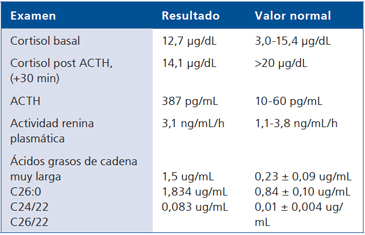 Por la historia de astenia y adinamia, asociada a pigmentación de encías y cicatrices de la piel, se planteó una insuficiencia suprarrenal, confirmada con los exámenes de laboratorio (Tabla 1); ello, en conjunto con las alteraciones en las neuroimagenes, sustentan la sospecha de Adrenoleucodistrofia ligada al X (ALD-X). La medición de ácidos grasos de cadena muy larga en plasma (Tabla 1) señaló niveles elevados de C26:0 y de la relación C24/22, C26/22, perfil característico y confirmatorio de ALD-X.