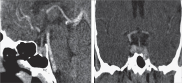 También se constató activación de su Acromegalia con niveles de GH de 12,7 ng/ mL, con Glicemias de 89,3 mg/dL basal, 190,8 mg/dL a los 30 minutos, 214,5 mg/dL a los 60, 199,3 mg/dL a los 90 y 123,2 mg/dL a los 120 minutos; con un IGF-1 de 674 ng/mL (Valor normal para edad: 87-238 ng/ mL). No se pudo realizar una Resonancia Nuclear Magnética por el Gadolinio; por lo cual luego de ingresar a hemodiálisis se realizó un TC de silla turca (Figura 1). En ésta, se apreció sólo cambios post quirúrgicos en el piso selar y un material con densidad de partes blandas ocupando la logia selar, de diámetro cráneo-caudal de no más de 6 mm.