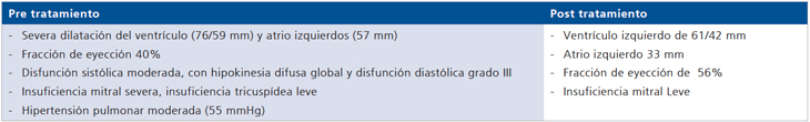Ingresa de urgencia en el año 2008 por Insuficiencia Cardiaca Congestiva, constatándose una Enfermedad Renal Crónica etapa IV y una Miocardiopatía Dilatada. Se realizó un Ecocardiograma el cual reveló severa dilatación del ventrículo izquierdo (76/59 mm), Disfunción Sistólica Moderada, con hipokinesia difusa global, más acentuada en pared posteroinferior y Disfunción Diastólica grado III. El atrio izquierdo se encontraba severamente dilatado (57 mm), con Insuficiencia Mitral severa, Insuficiencia Tricuspídea leve e Hipertensión Pulmonar moderada (55 mmHg). El Electrocardiograma mostraba crecimiento de ventrículo izquierdo y discretas alteraciones inespecíficas de la repolarización ventricular. La Tomografía Computada (TC) de Tórax mostraba derrame pleural bilateral, con aumento signifi cativo del tamaño radiológico del corazón, concluyendo que los hallazgos eran compatibles con proceso congestivo pulmonar cardiogénico.