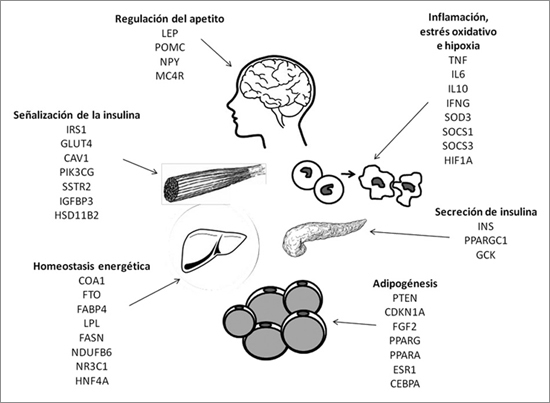 Algunos genes que sufren regulación epigenética por metilación de las CpGs de su promotor participan en procesos metabólicos clave relacionados con la obesidad, tales como la adipogénesis, el metabolismo energético, el almacenamiento y utilización de lípidos, la inflamación la señalización insulínica y la regulación del apetito. Algunos de ellos se muestran en la Figura 123.