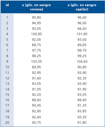 Dicho procedimiento consiste en representar gráficamente las diferencias entre dos mediciones frente a su media. Utilizaremos para ilustrar dicha metodología las mediciones de glicemia obtenidas en sangre obtenida por punción venosa y sangre capilar evaluada en un hemo gluco test. Supongamos que el procedimiento se realiza en 20 sujetos obteniéndose los siguientes resultados: