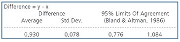 Este gráfico sugiere que las diferencias y-x son sistemáticamente distintas de cero, la idea de Bland-Altman es construir estas diferencias y establecer sus límites de confianza. Al ejecutar el procedimiento se obtiene: