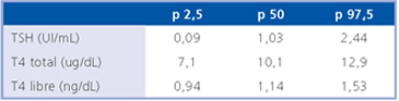 En base a los valores establecidos como normales para TSH en este grupo de pacientes, se establecieron los percentiles 2,5 y 97,5 para las variables TSH, T4 y T4 libre con negatividad de anticuerpos anti TPO (Tabla 2).