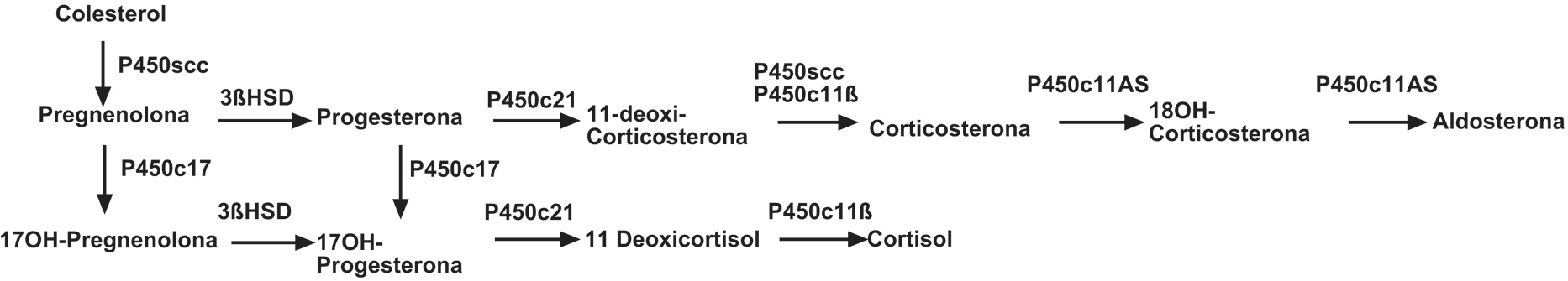 La biosíntesis de aldosterona está controlada por el citocromo P450c11AS (aldosterona sintetasa), el cual convierte en pasos sucesivos la 11-deoxicorticosterona en aldosterona. Este citocromo es codificado por el gen CYP11B2 el cual es regulado por angiotensina II y potasio vía proteína kinasa C. Esta enzima es diferente del citocromo P450c11ß (11ß-hidroxilasa), codificado por el gen CYP11B1 el cual es expresado en la zona fasciculata y es el encargado de convertir el 11-deoxicortisol a cortisol (Figura 1). Los genes CYP11B1 y CYP11B2 presentan una alta homología, con 90% de identidad en las secuencias intrónicas y 95% en las secuencias exónicas. Además, ambos están localizados en el brazo largo del cromosoma 829.