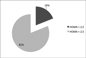 Se observó un valor promedio de glicemia 96,5 mg/dl. 47 pacientes (38,8%) presentaron glicemia de ayuno mayor a 100 mg/dl. Comparamos presencia de IR en pacientes con disglicemia observando HOMA > 2,5 en el 78,7% de las pacientes (p 0,8) (Figura 4).