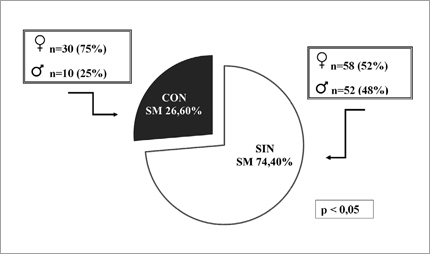 La presencia de SM se pesquisó en 40 pacientes (26,6%); la distribución de los DM1 según presencia de SM y género aparece en la Figura 1, se puede apreciar que una mayor proporción de mujeres presenta SM.