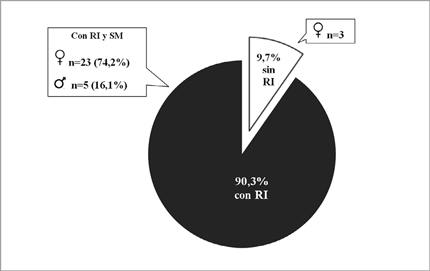 Para la determinación de la RI en los DM1, del total de 40 pacientes con SM, se debieron excluir 9 por tener HbA1c> 11,4%. Al aplicar la fórmula a los 31 sujetos restantes, 90,3% tenían RI, con diferencias de género: 23 mujeres (74,2%) y 5 hombres (16,1%) (p < 0,05). Estos resultados se presentan en la Figura 2.