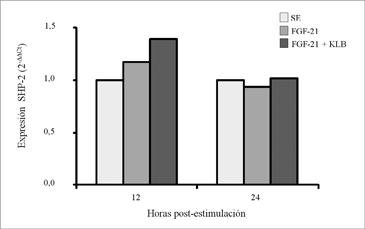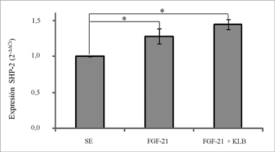 FGF-21, FGF -21 + KLB. At 12 and 24 hours after induction total RNA was extracted and SHP-2 mRNA levels were determine by quantitative PCR. Expression of GADPH gene was employed for normalization. Results: Incubation with FGF-21 produce a 36% (p = < 0,05) increment in SHP-2 expression, which was not modified with KLB co-incubation. Discussion: It is shown by the first time that FGF -21 is able to produce an increase in SHP-2 gene expression in human fibroblast, which was independent of KLB presence.