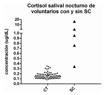 El síndrome de Cushing (SC) es un trastorno endocrino caracterizado por altos niveles de cortisol, ya sea endógeno o por administración de corticoides. Uno de los primeros hallazgos en los pacientes que padecen SC endógeno es la pérdida del ciclo circadiano del cortisol. Los valores en sangre de los pacientes tienden a ser constantes durante el día, o bien no disminuyen significativamente6. La utilización del cortisol salival nocturno, ha resultado muy útil en el diagnóstico de SC independientemente de la etiología; enfermedad de Cushing, SC adrenal o tumores ectópicos12,13.
