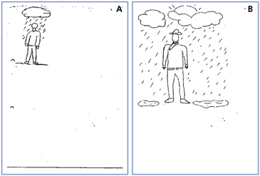 Figura 1. Dibujos persona bajo la lluvia. A) pre-intervención; B) post-intervención.