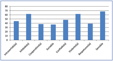 Test de personalidad de Millon5 fue elaborado para elucidar y cuantificar los rasgos de personalidad de los adolescentes, obteniendo información de los valores de los adolescentes normales y de aquellos que necesitan ser ayudados en el marco clínico. Los rasgos de personalidad predominantes del caso, según este test (Figura 3) son: inhibido, violento y sensible.