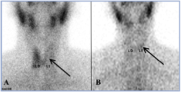 La paciente evolucionó clínicamente con una tiroiditis subaguda migratoria ya que inicialmente consultó por dolor cervical lateralizado a izquierda coincidente con la ausencia de captación del lóbulo tiroideo izquierdo en el cintigrama y un mes después se agregó dolor y aumento de volumen del lóbulo derecho con un nuevo cintigrama que mostró ausencia total de captación en la región tiroidea. Esto probablemente explicaría el larvado y prolongado cuadro clínico que presentó la paciente. Si bien la tiroiditis subaguda debuta con dolor unilateral hasta en un 45% de los casos13, no se encontró descrito en la literatura este patrón cintigráfico. Lo interesante del caso es la asimétrica distribución inicial del radiofármaco, con preservación de la captación de un lóbulo concomitante con la TSH frenada, lo que sumado a la VHS poco elevada, obligó a descartar otras causas de hipertiroidismo.