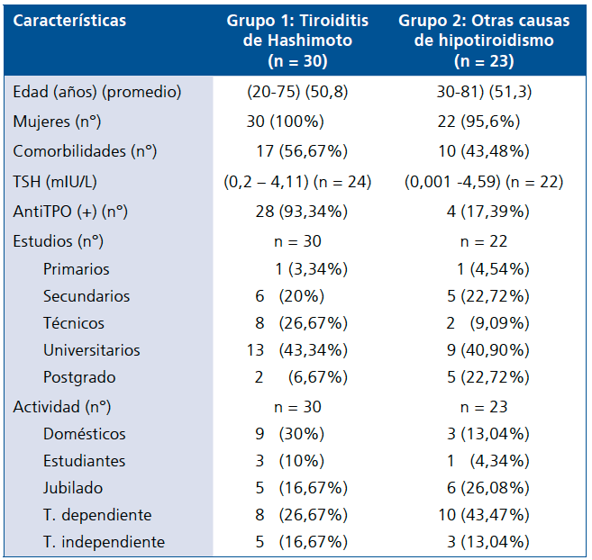 Se encuestaron 53 pacientes, siendo 52 (98%) de los participantes de sexo femenino. El rango de edad fue entre 20-81 años, presentando una media de 51 años. Las características de ambos grupos estudiados se encuentran representadas en la Tabla 1.