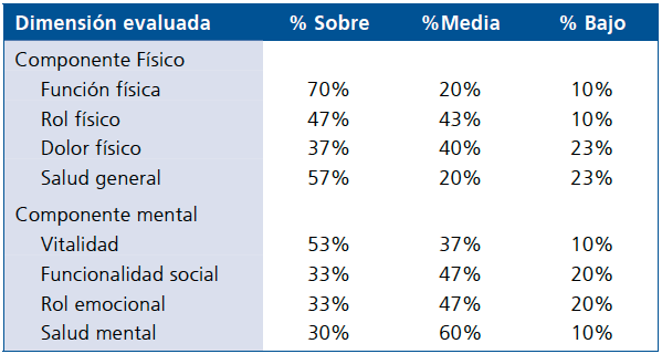 Al analizar el total de la muestra para cada dimensión de calidad de vida no se encontraron valores bajo la normalidad (Figura 2). Las otras dimensiones de calidad de vida se muestran en la Tabla 4.