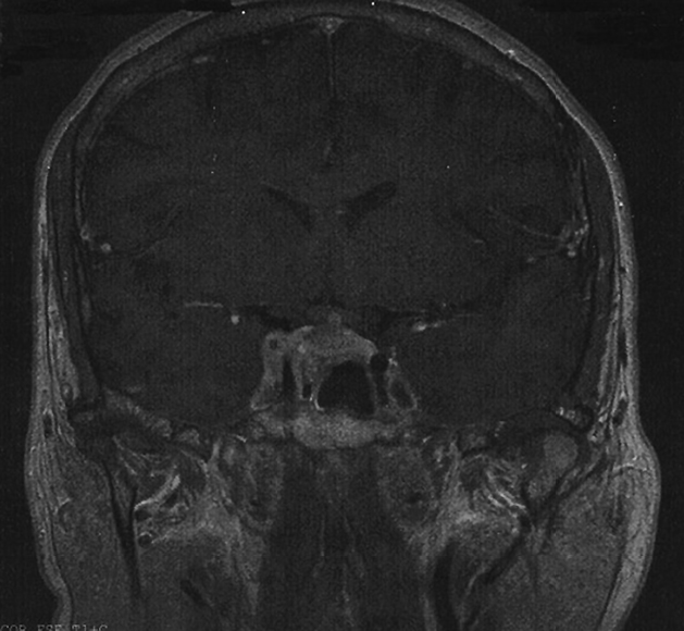 Figura 1. Resonancia Magnética que demuestra macroadenoma hipofisario que invade el seno cavernoso derecho.
