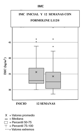 Tabla 1. Parámetros antropométricos y de laboratorio al inicio y posterior a 12 semanas de tratamiento con Formoline L112®.