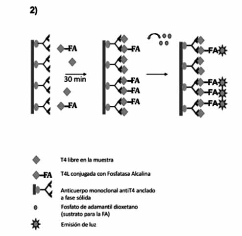 El ensayo que realiza el equipo Siemens es distinto del anterior. Los elementos que usa son los siguientes: T4 libre del suero, T4 conjugada con fosfatasa alcalina (FA) y bolitas recubiertas con un anticuerpo monoclonal especifico anti T4 (fase sólida). La muestra del paciente se incuba con la T4 conjugada con fosfatasa alcalina y con la bolita recubierta con una cantidad limitada de anticuerpo anti-T4. Durante ese tiempo, la T4 libre presente en el suero compite con la T4 conjugada con FA por los sitios de unión del anticuerpo que recubre la bolita. Luego se centrifuga. El sobrenadante que contiene la T4 del paciente no unida al anticuerpo y la T4-conjugada con FA que tampoco se unió al anticuerpo se eliminan. Finalmente se añade al tubo de reacción, el sustrato para la fosfatasa alcalina. Este es un fosfato de adamantil dioxetano que es defosforilado por acción de la fosfatasa alcalina, generando un intermediario inestable que se rompe rápida y espontáneamente emitiendo luz que se mide en un luminómetro. La señal de luz es inversamente proporcional a la concentración de T4 libre presente en la muestra del paciente.
