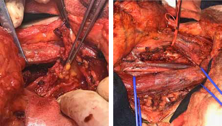 Figura 2: Vaciamiento lateral derecho.La anatomía patológica informa carcinoma papilar en LD 25 mm de eje mayor, tipo clásico, intratiroideo que invade la cápsula sin evadirla; vaciamiento ganglionar: 9 ganglios metastásicos en sectores IIA, IIB y III de un total de 35 extraídos. El ganglio que se visualizó la ecografía como sospechoso y la PAAF fue negativo para malignidad, mostró un foco metastásico de 5mm de eje mayor. Se realizó dosis terapéutica de I 131 (130 mCi).
