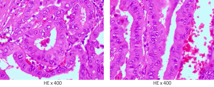 La variante de células altas se define como un tumor papilar que presenta el 50% o más de células, por lo menos dos veces más altas que anchas, con citoplasma eosinofílico y núcleo en “vidrio esmerilado”, grande, pálido, de contorno irregular con hendiduras y pseudoinclusiones dirigido hacia membrana basal2.