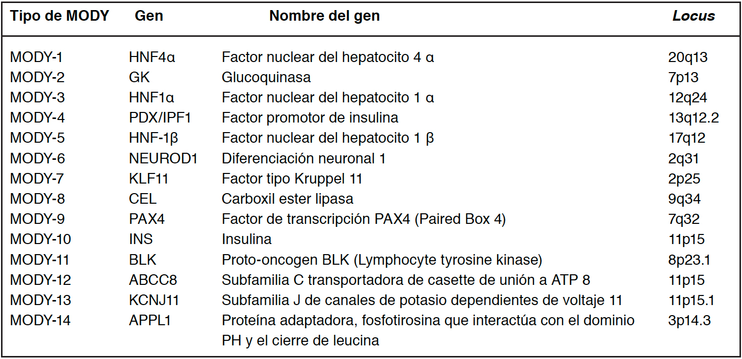 Se indican los 14 tipos de MODY que se conocen actualmente, el gen donde se ubica la mutación y el locus o ubicación cromosómica del gen afectado.