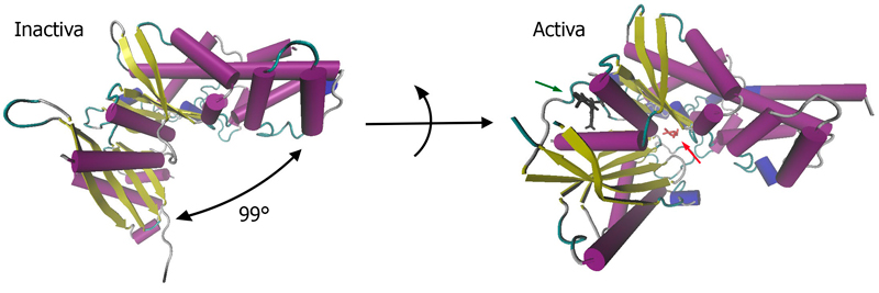 La GK es una enzima monomérica de ~53 kDa. Se compone de un dominio mayor y otro menor, ambos unidos por un interdominio en forma de hendidura, región donde se ubica el sitio de unión a glucosa. Estos dominios pueden formar dos estructuras, conocidas como “cerrada” y “super-abierta”3 (Figura 1). Entre estos dominios se identifica una región denominada “conectora” o “loop I”16, la cual se presenta como una estructura relajada y flexible, en contraste con la estructura rígida que presenta la hexoquinasa I. La GK posee un segundo sitio de regulación alostérica para la unión de activadores, el cual se ubica a 20 Å del sitio de unión a sustrato, y se forma sólo cuando la GK se encuentra en su estado activo3.