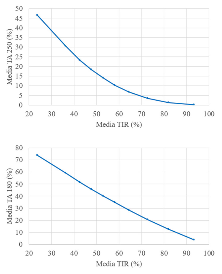 A mayor tiempo en rango hubo un menor TA250 (decil 1: 46,5%, decil 10: 0,2%, diferencia: -46,3%, p<0,05) y TA180 (decil 1: 73,9%, decil 10: 3,8%, diferencia: -70,1%, p<005) (Figura 4, Tabla 1).