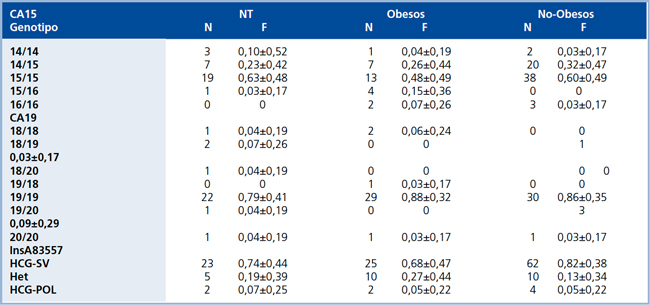 Tabla 3. Frecuencias genotípicas (F) de las regiones microsatélites, CA15 y CA19 y de InsA83557 del gen HSD11B1 en pacientes HE, obesos y no obesos y sujetos normotensos (NT).