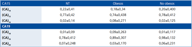 Identificacion y genotipificacion de las zonas microsatelites, CA15 y CA19, e InsA83557. En HE y normotensos se detectaron tres variantes alelicas diferentes; para CA15 se detectaron 14, 15 y 16 repeticiones; para C19 se detectaron 18, 19 y 20 repeticiones. InsA83557 presento a su vez tres genotipos distintos: homocigoto silvestre (HCGSV), heterocigoto (HET) y homocigoto polimorfico (HCG-POL). En HE las regiones microsatelites cumplian con el equilibrio de H-W, tanto en el subgrupo obesos como en HE noobesos para CA15 (χ2 =1,129; 3 GL; p =0,77 y χ2 =3,236; 3 GL;p =0,357, respectivamente) para C19 (χ2 =4,27; 4 GL; p =0,371 y χ2 =1,218; 3 GL; p =0,128, respectivamente) y para la InsA83557 (χ2 =1,85; 2GL; p =0,404 y χ2 =0,164; 2 GL; p=0,921, respectivamente). En normotensos, el CA15 presento equilibrio H-W (χ2 =6,563; 3 GL; p =0,083), a diferencia del CA19 y la InsA83557 que no lo presentaron (χ2 =26,298; 5 GL; p <0,001 para CA19; χ2 =17,885; 2 GL; p <0,001 para InsA83557). Las frecuencias genotipicas de las tres regiones variables se presentan en la Tabla 3, mientras que las frecuencias alelicas de los microsatelites se presentan en la Tabla 4.