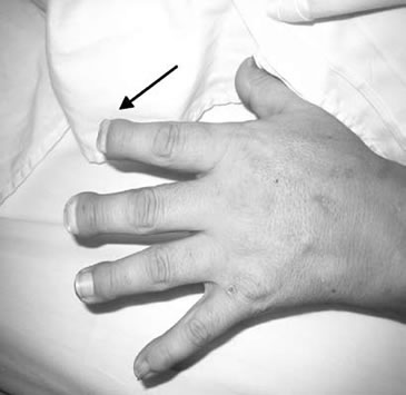 Al examen físico destacaba que la talla corporal era 5 cm menor que la registrada 10 años antes; presión arterial 150/90 mmHg; además, desaparición parcial con acortamiento notorio de las segundas y terceras falanges terminales de ambas manos (Figura 2). La extensión de ambos brazos estaba notoriamente disminuida, generando dolor, sin evidencia de otras deformidades óseas.