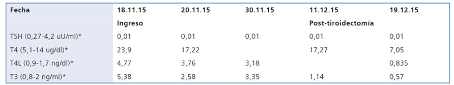 Ya estable, aún con TTC, se extuba, y a las 24 h. presenta 2 episodios convulsivos. Se evalúa por neurólogo con TAC de cerebro normal, se interpreta como secundario a TTC severa, por lo que se plantea tiroidectomía total. Considerando poca respuesta a tratamiento médico, se realiza preparación preoperatoria con amiodarona y lugol 5 días, con procedimiento quirúrgico sin incidentes. La biopsia informa hiperplasia nodular tiroidea, con tiroiditis linfocitaria asociada, sin elementos de malignidad. Evoluciona favorablemente post-cirugía, sin nuevos episodios convulsivos, sólo leve disfonía, con hemograma, perfil hepático, calcemias dentro del rango de normalidad. La evolución del perfil tiroideo se esquematiza en la Tabla 1.