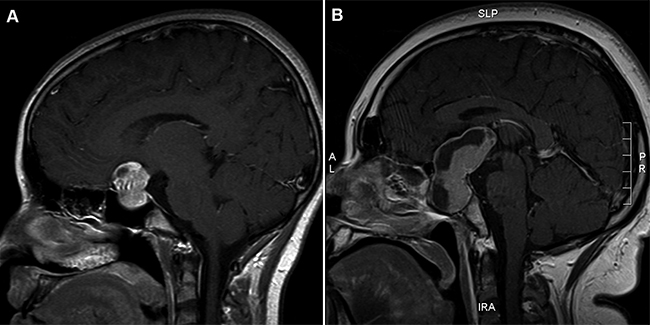 Figura 1. RM (secuencia T1) de la región selar de casos 1 (A) y 2 (B).