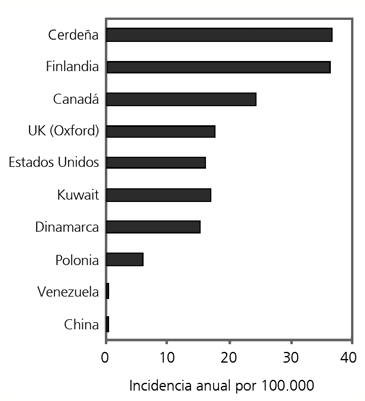 Epidemiología: La DM1 corresponde aproximadamente al 10% de todos los casos de Diabetes y afecta más a niños y jóvenes con ancestros europeos. Existe una marcada diferencia geográfica en su incidencia, la que se manifiesta como una posibilidad mucho mayor de contraer la enfermedad para un niño finlandés que para uno venezolano (Figura 1).