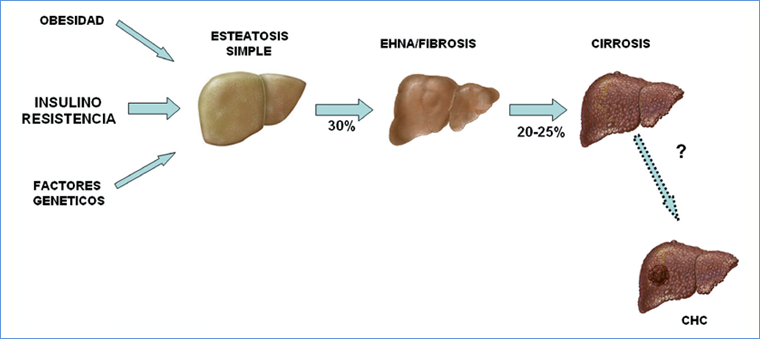 Figura 1. Espectro del hígado graso no alcohólico (HGNA). La obesidad, factores genéticos y sobre todo la resistencia a la insulina contribuyen al depósito anormal de grasa en el hígado. Alrededor del 30% de los pacientes con HGNA son portadores de esteatohepatitis no alcohólica (EHNA), que se caracteriza por la presencia de diversos grados de inflamación y la fibrosis y que puede progresar a cirrosis en el 20- 25% de los pacientes después de 20 años. Un porcentaje desconocido de los pacientes puede desarrollar carcinoma hepatocelular (CHC).