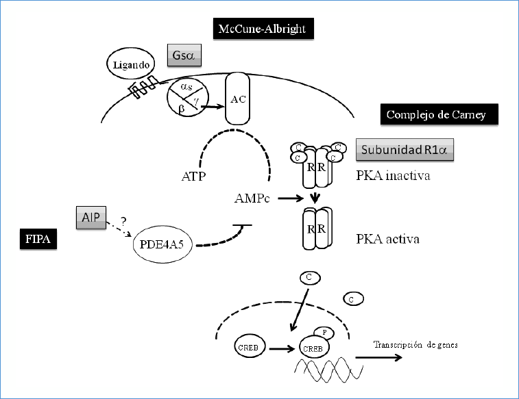 AIP es capaz de unirse y atenuar la función de PDE4A5, fosfodiesterasa hipofisiaria a cargo de inactivar la vía de la PKA mediante la hidrólisis del AMPc61. Este nexo entre AIP y la vía de la PKA es atractivo y se sabe que mutaciones de otra fosfodiesterasa, PDE114A, se asocian a formas esporádicas de hiperplasia micronodular pigmentada en las cuales el AMPc está elevado. Esto conecta con el conocimiento sobre el nexo entre vía del AMPc y la acromegalia del McCune-Albright y CC (Figura 1).