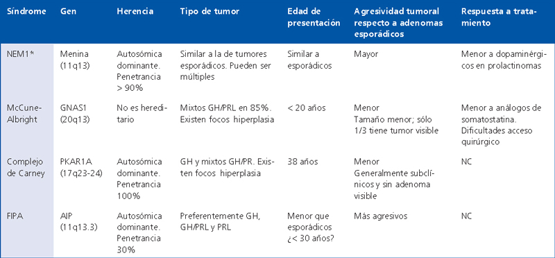 La presente revision tiene como objeto revisar los mecanismos moleculares envueltos en la aparicion de tumores hipofisiarios en los diferentes sindromes geneticos, asi como sus caracteristicas clinicas y particularidades, con el fin de facilitar al medico tratante la identificacion y manejo de esta patologia (Tabla 1).