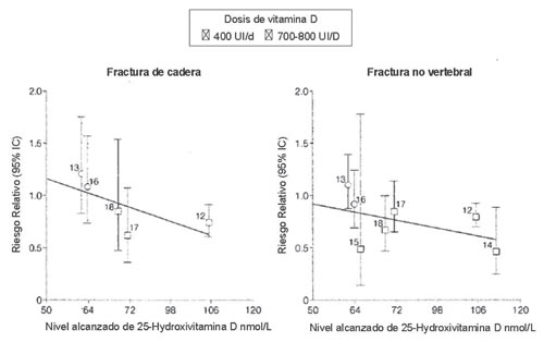 Los resultados de dos metanálisis recientes5,20 respaldan la importancia de la vitamina D en cuanto a la reducción del riesgo de caídas y fracturas osteoporóticas en personas de edad avanzada ambulatorias e institucionalizadas. La prevención de fracturas fue óptima en estudios con niveles promedio alcanzados de 25(OH)D de ~40 ng/mL~100 nmol/l; (Figura 2)20.