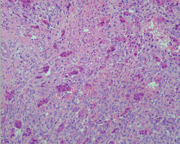 Figura 1. Tumor pardo caracterizado por una proliferación fibrohistiocítica vascularizada y con células gigantes multinucleadas de tipo osteoclasto. (Tinción Hematoxilina- Eosina. Ampliación 40X).