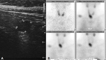 Figura 2. A) Ecografía cervical que muestra nódulo hipogénico de 3 por 1,2 cm inferior en el lóbulo tiroideo derecho, compatible con adenoma paratiroídeo. B) Cintigrama paratiroídeo con Tc99 SESTAMIBI.
